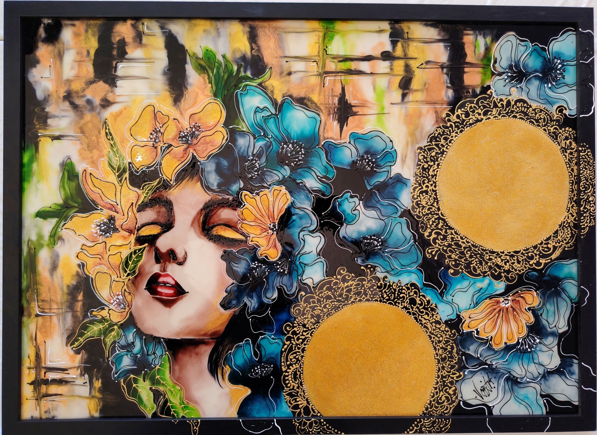 A kép üvegfestékkel készült. Felülete fényes, csillogó, a fény megcsillanása a felületen minden pillanatban más ragyogást ad a képnek. Az alap művészplexi, így szállítása biztonságos.