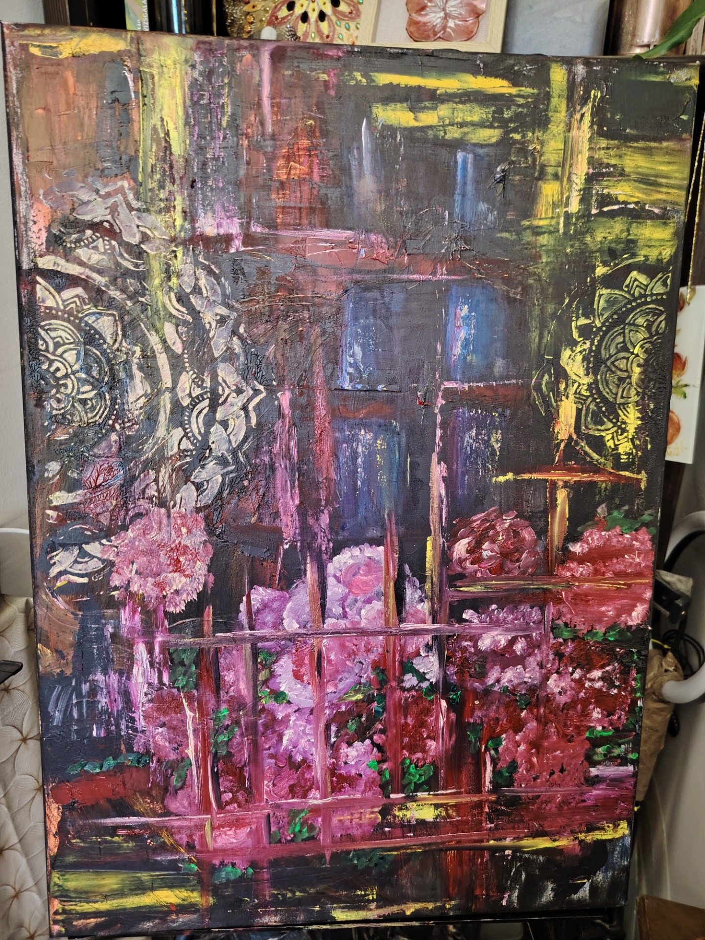 A kép olajfestékkel készült. Prógálgattam a hangulatokat, virágokat, spiritualitást egy térbe helyezni.