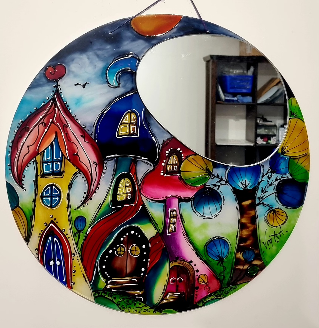 Kedves , színes girbe gurba házas kép- tükör dekorációval.